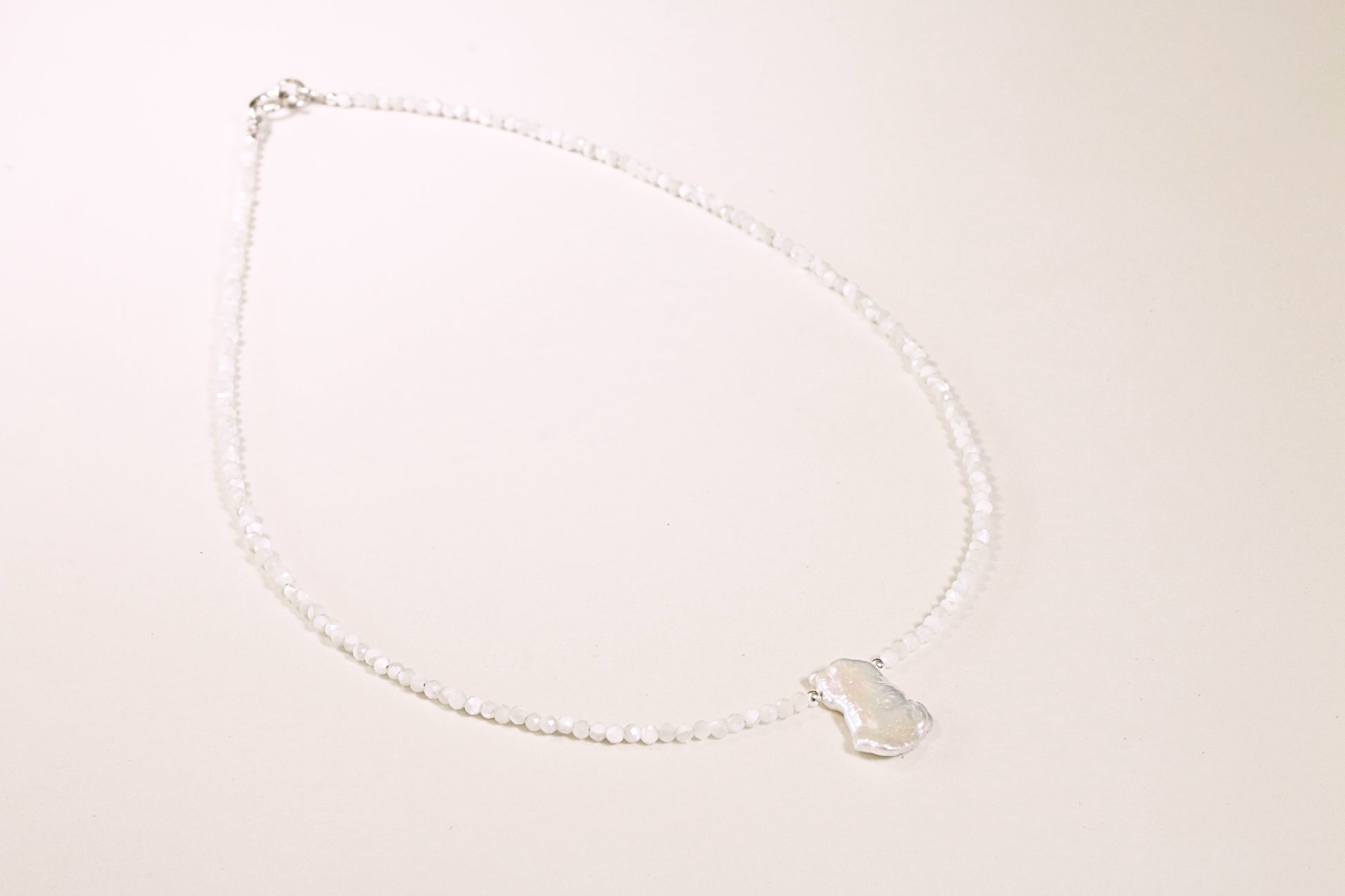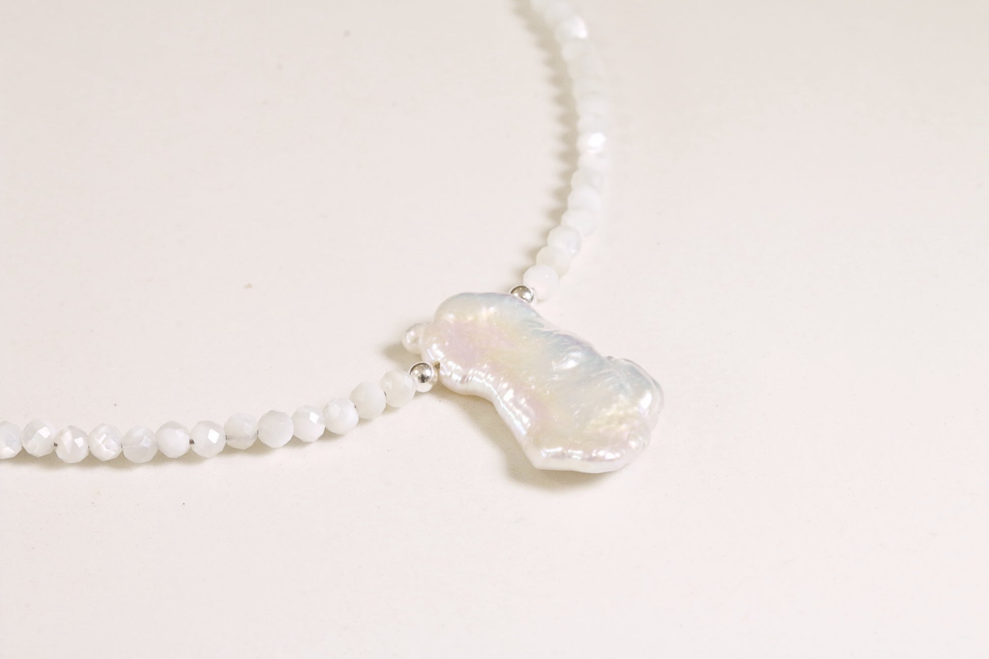 My most favourite product of the new collection! I cannot explain how sparkly this necklace is, it catches the light in every way possible. The beads are made from Shell with a baroque pearl pendant. 16 inch chain.
