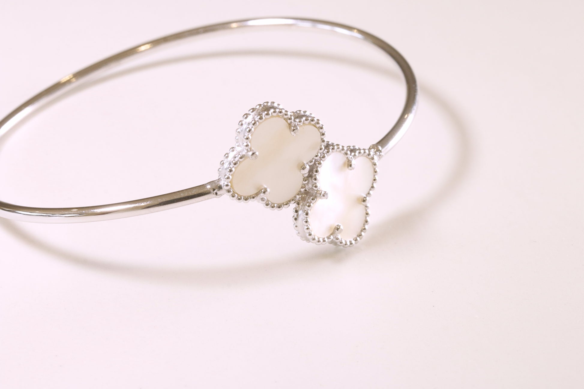 Sterling silver cuff bangle, decorated with Shell clovers. A gorgeous addition to our clover collection - the shell is iridescent in different lights.The bracelet is 'flexi-design' so it can be opened and closed to wear.