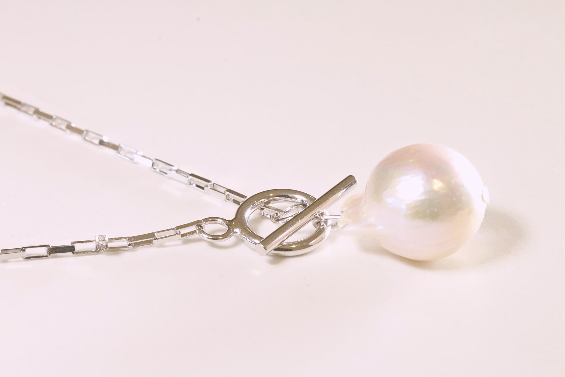 Similar to its sister product 'freshwater Gold link Necklace' - This product has a vintage style chain, set in Sterling silver with a large fresh water pearl.